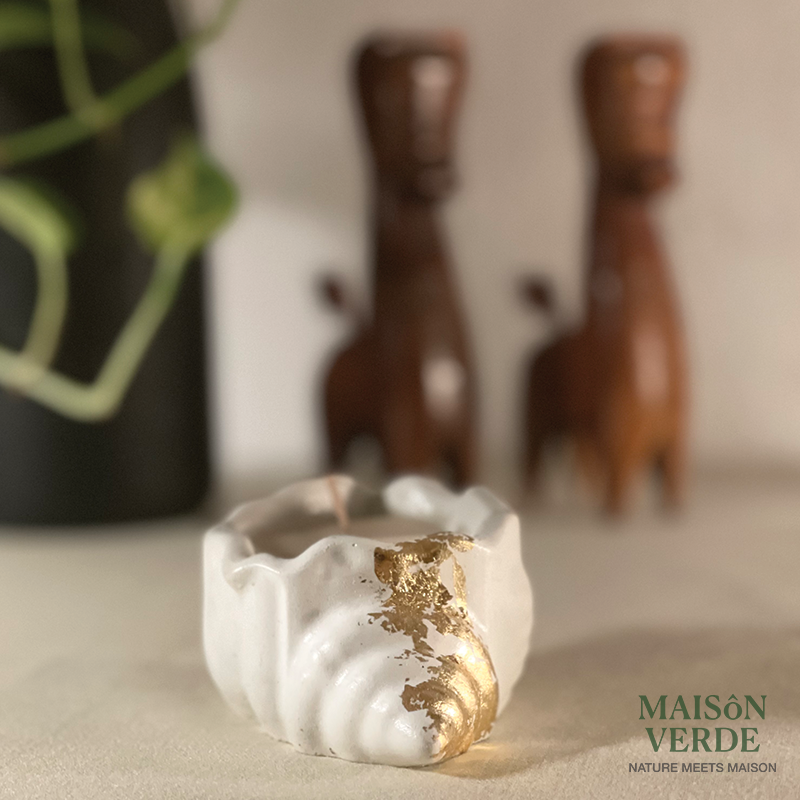 A handcrafted Maison Verde Atelier piece, cast in a sculpted concrete conch shell and finished with subtle gold-leaf detailing. Each candle is hand-poured in small batches using a refined soy-wax blend for a warm, elegant glow.