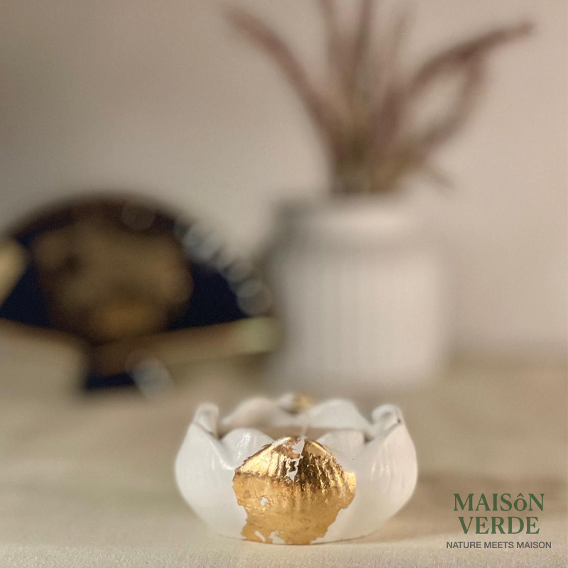 A handcrafted Maison Verde Atelier piece, cast in a sculpted concrete lotus form and finished with soft gold accents. Minimal, artistic, and serene — this candle brings a refined, meditative elegance to your rituals, styling corners, and thoughtful gifting moments.