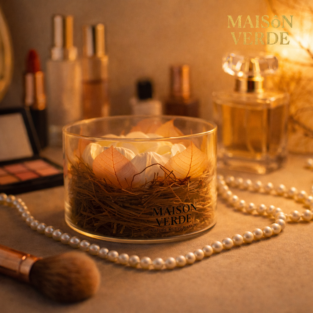 Hand-arranged in small batches, this botanical potpourri is designed to scent and style your space with understated sensuality. The fragrance unfolds slowly and intimately, creating an atmosphere that feels enveloping, elegant, and softly luminous. Finished with a translucent skeleton leaf veil — each one uniquely shaped and softly varied in tone.